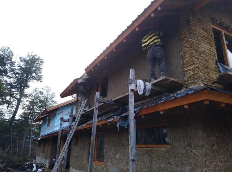 Hay muchas técnicas para construir una casa de barro, cada una con sus ventajas y desventajas, y la adecuada dependerá de la zona en la que vivimos, la mano de obra con la que contamos, y otros factores. Lo que primero se nos viene a la cabeza es una casa de adobes, esos ladrillos de tierra cruda, tan comunes en el norte del país. Pero, para nuestra zona de clima frío no los recomendamos para muros exteriores, dado que no es un buen material aislante. Aquí, se debería construir con otras técnicas que involucren materiales livianos, que mezclados con barro permiten levantar las paredes con encofrados, caña coligüe, o directamente con fardos de paja. Estos muros luego son revestidos con revoques de tierra, que los protegen y a su vez les dan una terminación de calidad. Si bien los revoques pueden llegar a tener un componente que los hace resistentes al agua, distan mucho de ser impermeables. Por eso, es fundamental en este tipo de casas tener diseños con buenos aleros, para impedir que la lluvia toque las paredes.