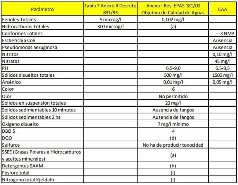 Los parámetros cuyos límites fueron superados en todos o algunos de los puntos muestreados son los de Fenoles, Bacterias Coliformes Totales y Bacterias Escherichia Coli.