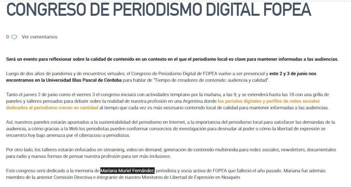 Según se anunció en la propia página web oficial de FOPEA, no solo será la proyección del video en la apertura, sino que todo el Congreso en sí será “dedicado a la memoria de Mariana Fernández, quien fuera socia activa de la institución, ex miembro de la Comisión Directora y una de las responsables del Monitoreo de Liberad de Expresión”.
