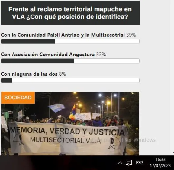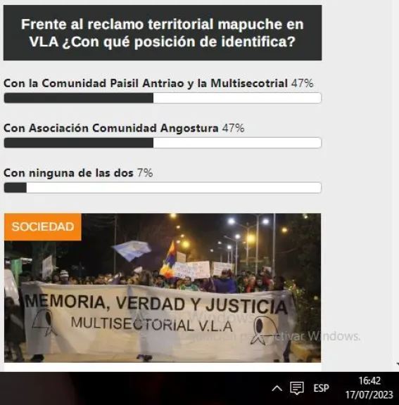 PD: Finalmente la encuesta se cerró a las 00:00 hora con el siguiente resultado: 49 % a favor de “Asociación Comunidad Angostura”, 48 % a favor de “Comunidad Paisisl Antriao y Multisectorial” y 3 % Ninguna de las dos”.
