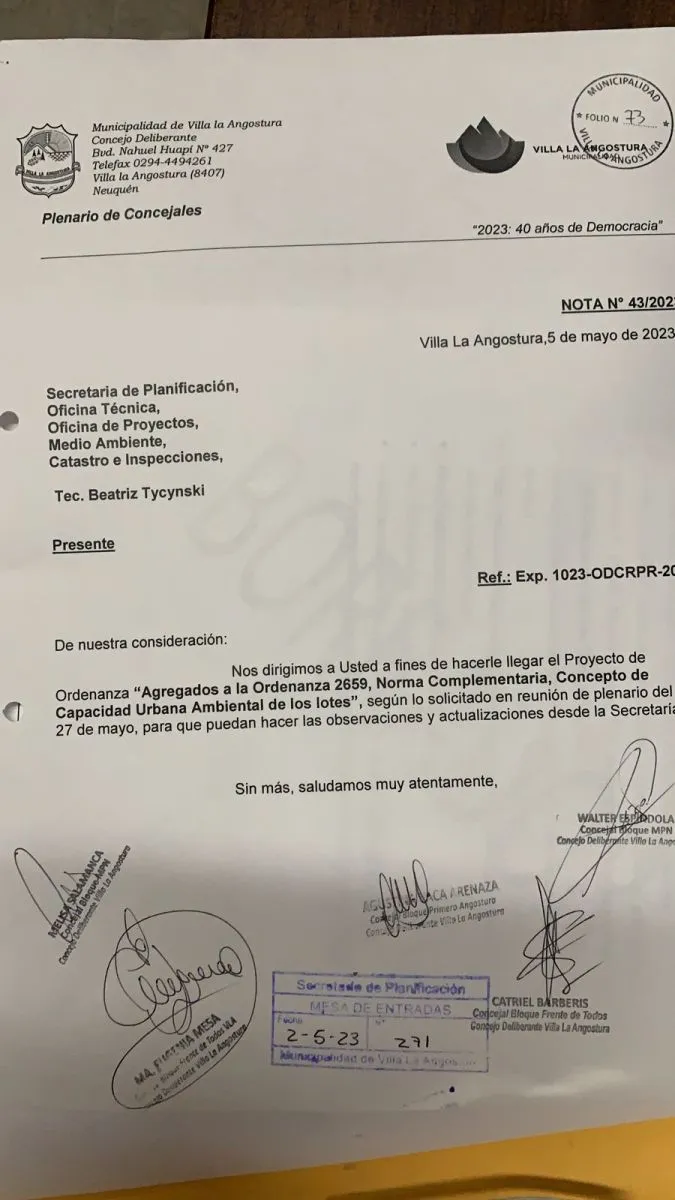 En una nota que le remitieron todos los bloques fechada el 9 de noviembre del 2021 (firmada por el entonces Presidente del Concejo, David Tressnes, Marta Cicconi, María Eugenia Mesa y Agustina Vacca Arenaza), se le pedía a la Secretaría de Planeamiento, Oficina Técnica, Oficina de Proyectos, Medioambiente y Catastro que se expidiera sobre el proyecto de ordenanza.