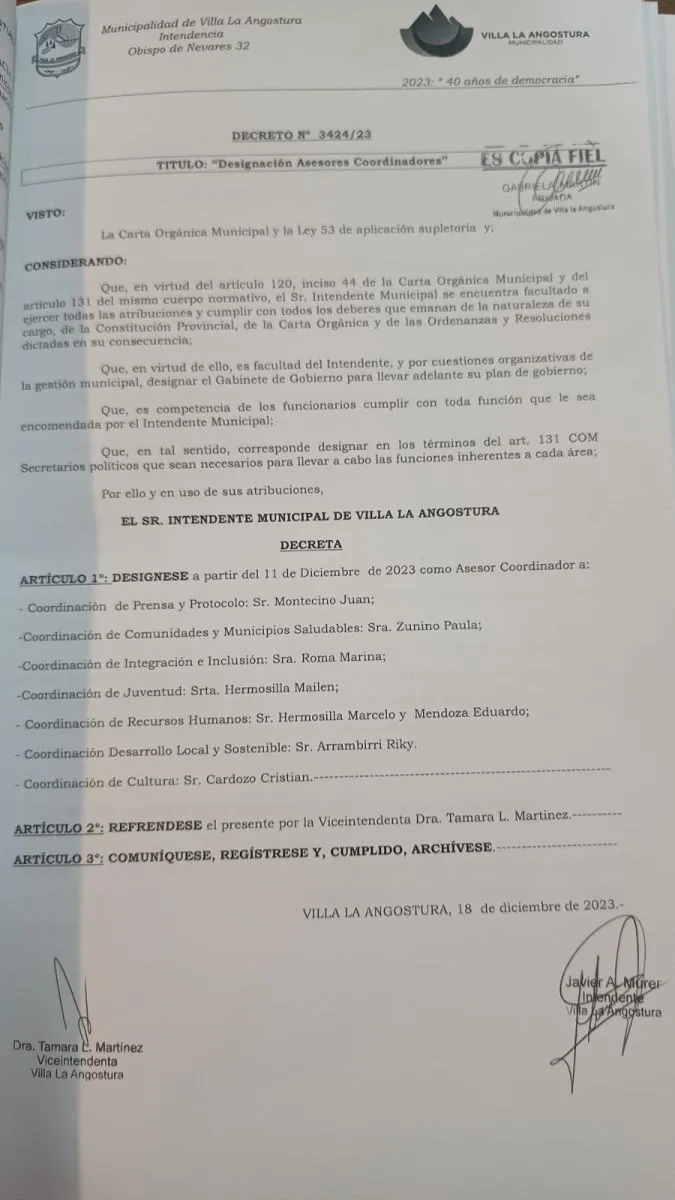 Según el Decreto N° 3424/23 que firmó el propio Murer el pasado 18 de diciembre, los cargos de coordinadores que se crearon fueron: