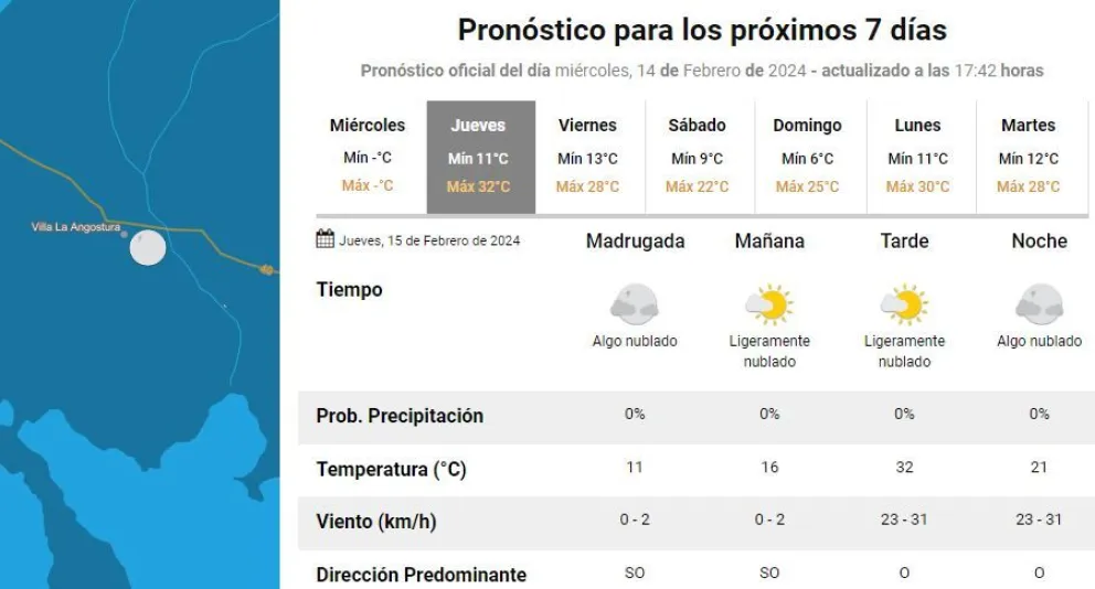 El organismo nacional indicó que en la provincia de Neuquén, se registrarán temperaturas extremas por calor en el sur de Aluminé, Villa La Angostura, San Martín de los Andes y Junín de los Andes. En estos lugares habrá este jueves temperaturas en torno a los 30 grados, según el pronóstico extendido de la Autoridad Interjurisdiccional de Cuencas.