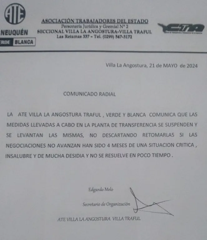 Por medio de un comunicado oficial del gremio ATE Lista Verde y Blanca, se informó hace instantes que se levantó la medida de fuerza que llevaban adelante y consecuentemente, vuelven a sus funciones los empleados del sector.