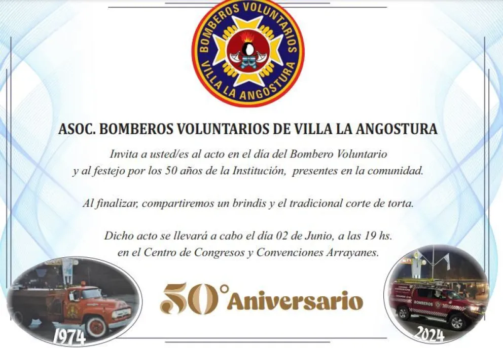 Sociedad El próximo domingo, Bomberos invita a celebrar su 50 Aniversario 31/05/2024 El próximo domingo, Bomberos invita a celebrar su 50 Aniversario Comunicado Temas de esta nota Bomberos Voluntarios Te puede interesar Neuquén prorroga la Emergencia Ígnea por un año ante el alto riesgo de incendios Un camionero dio 0,28 en alcoholemia, asegura que no bebió y reclama su licencia El deseo en la pareja: Tiempos de encuentros y desencuentros en una relación Amenazas de tiroteos: ATEN advirtió que “la escuela sola no puede” ante amenazas Hoy se muda el Juzgado de Paz: dónde funcionará Abren inscripciones al Plan Calor 2026: Cómo y dónde anotarse El CPE instrumentó acciones ante amenaza en las escuelas CPEM 68: tras una amenaza de tiroteo escrita en un baño, aplican restricciones a los alumnos Últimas noticias Neuquén prorroga la Emergencia Ígnea por un año ante el alto riesgo de incendios Un camionero dio 0,28 en alcoholemia, asegura que no bebió y reclama su licencia El deseo en la pareja: Tiempos de encuentros y desencuentros en una relación Amenazas de tiroteos: ATEN advirtió que “la escuela sola no puede” ante amenazas Carpinteros del Sur respondió en Chile y ratificó su nivel en Bariloche Aguirre y Tojo dieron el presente en la primera fecha del Turismo Pista del Valle