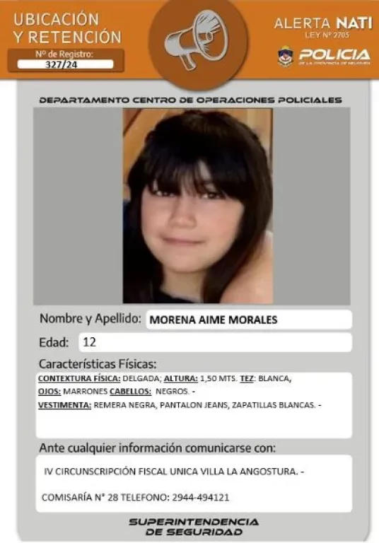 La menor, es de contextura física delgada, de aproximadamente 1,50 metros de altura, tez blanca, ojos marrones y cabello negro. Al momento de su desaparición, vestía una remera negra, pantalón jeans y zapatillas blancas.