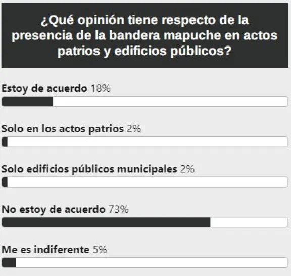 En ese marco, y tras la sugerencia realizada por oyentes en FM Andina, este medio decidió consultar a sus lectores: “¿Qué opinión tiene respecto de la presencia de la bandera mapuche en actos patrios y edificios públicos?"