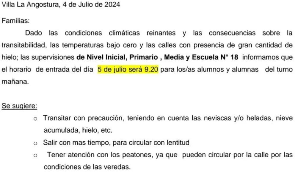En respuesta a las severas condiciones climáticas que afectan la región, el Consejo de Educación Provincial emitió un comunicado dirigido a todas las familias de la comunidad educativa. Debido a las bajas temperaturas, la acumulación de hielo en las calles y la peligrosidad en la transitabilidad, las supervisiones de Nivel Inicial, Primario, Media y la Escuela N° 18 han decidido modificar el horario de entrada para los estudiantes del turno mañana.