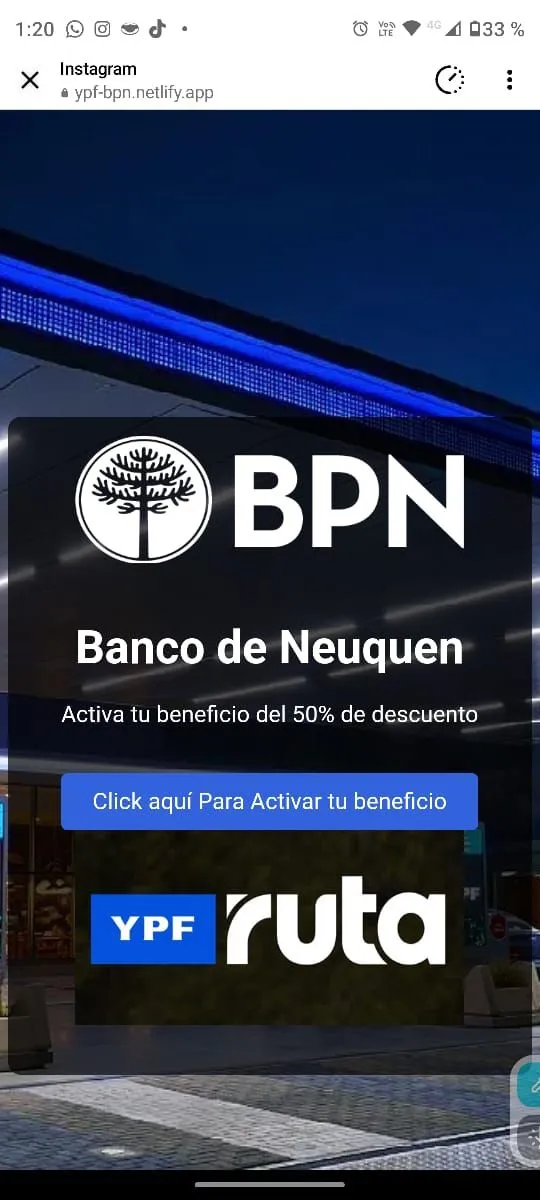 En los últimos diez días, se registraron varias publicaciones por Instagram de una página web falsa del Banco Provincia del Neuquén (BPN), donde se ofrecen, “descuentos del 50 % en combustibles.”