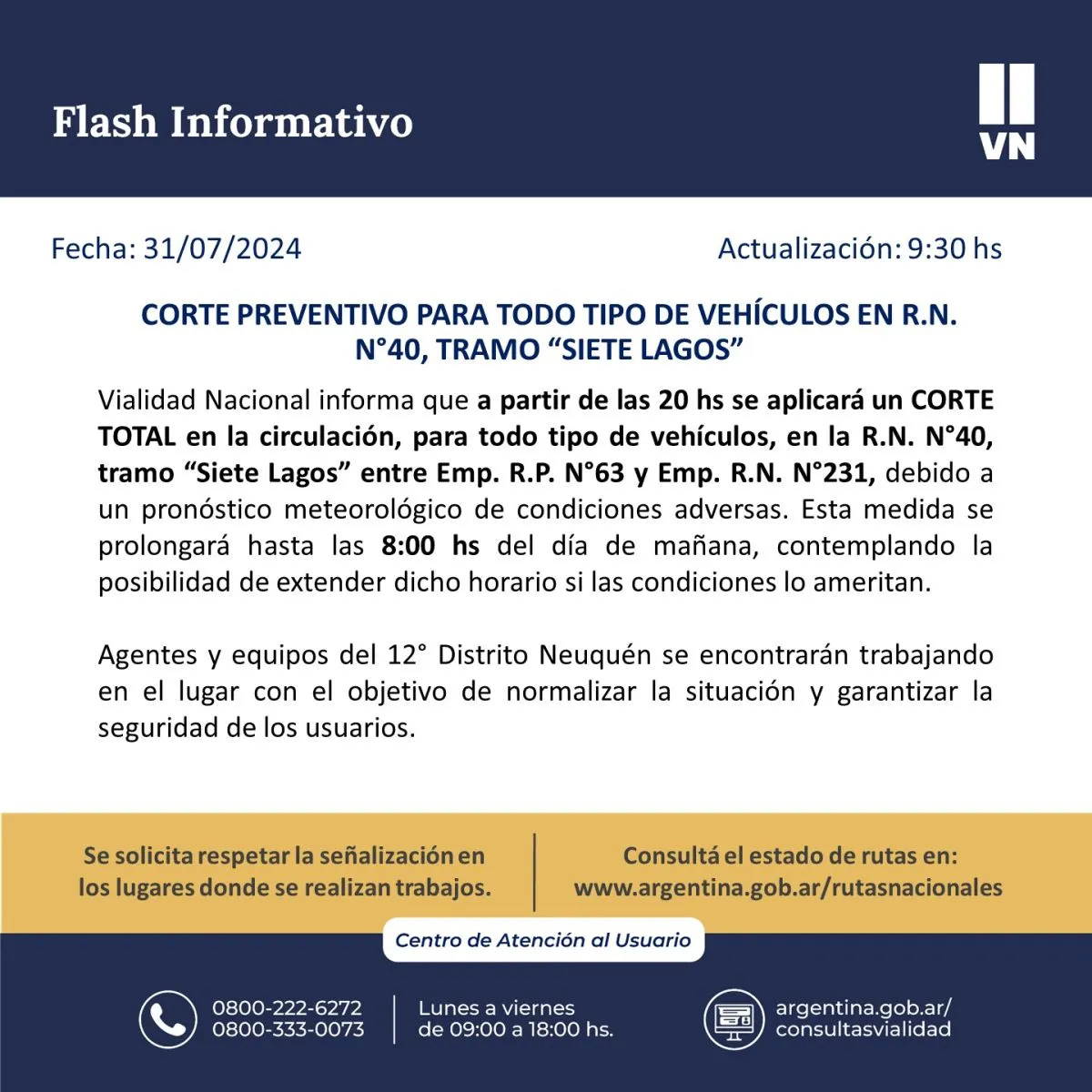Sociedad Por el Alerte Meteorológico, a las 20 cierra la circulación en la Ruta 7 Lagos 31/07/2024 Por el Alerte Meteorológico, a las 20 cierra la circulación en la Ruta 7 Lagos Te puede interesar Pescaban el el lago Falkner y debieron ser socorridos por Prefectura Concurso de taxis y remis: publican orden de mérito Este viernes se inicia la vacunación antirrábica gratuita Renaper y Correo Argentino tienen demoras en la entrega de DNI y pasaportes Prevén subas en luz y gas por mayores costos de importación y alta demanda El municipio anunció que "avanza la conexión al gas natural" El EPEN informó cortes de luz para esta semana: horarios, calles y barrios afectados Con un nuevo dron salen a fiscalizar y monitoreo daños ambiental Últimas noticias Tras la reestructuración que bajó el rango a Deportes, Naretti aseguró que se incrementó el presupuesto para el área Pescaban el el lago Falkner y debieron ser socorridos por Prefectura Concurso de taxis y remis: publican orden de mérito Las Piedritas y el Depo dijeron presentes en la 15ta edición de Bariloche Cup El camino hacia la final por el ascenso de Las Piedritas Este viernes se inicia la vacunación antirrábica gratuita