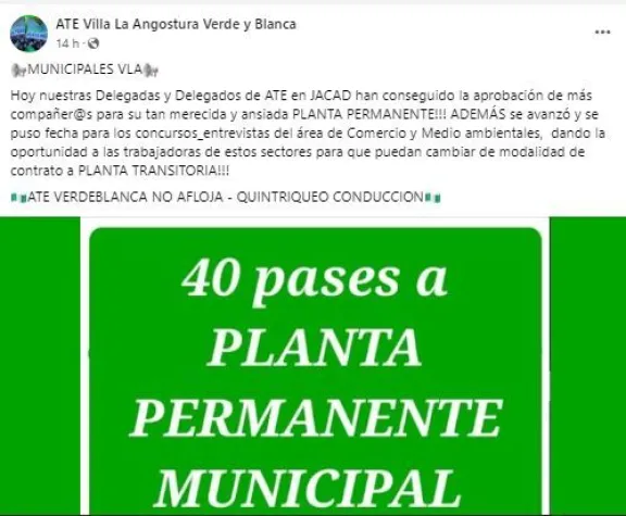 Según comunicó ATE en su Facebook, “hoy nuestras Delegadas y Delegados de ATE en JACAD han conseguido la aprobación de más compañer@s para su tan merecida y ansiada PLANTA PERMANENTE!”