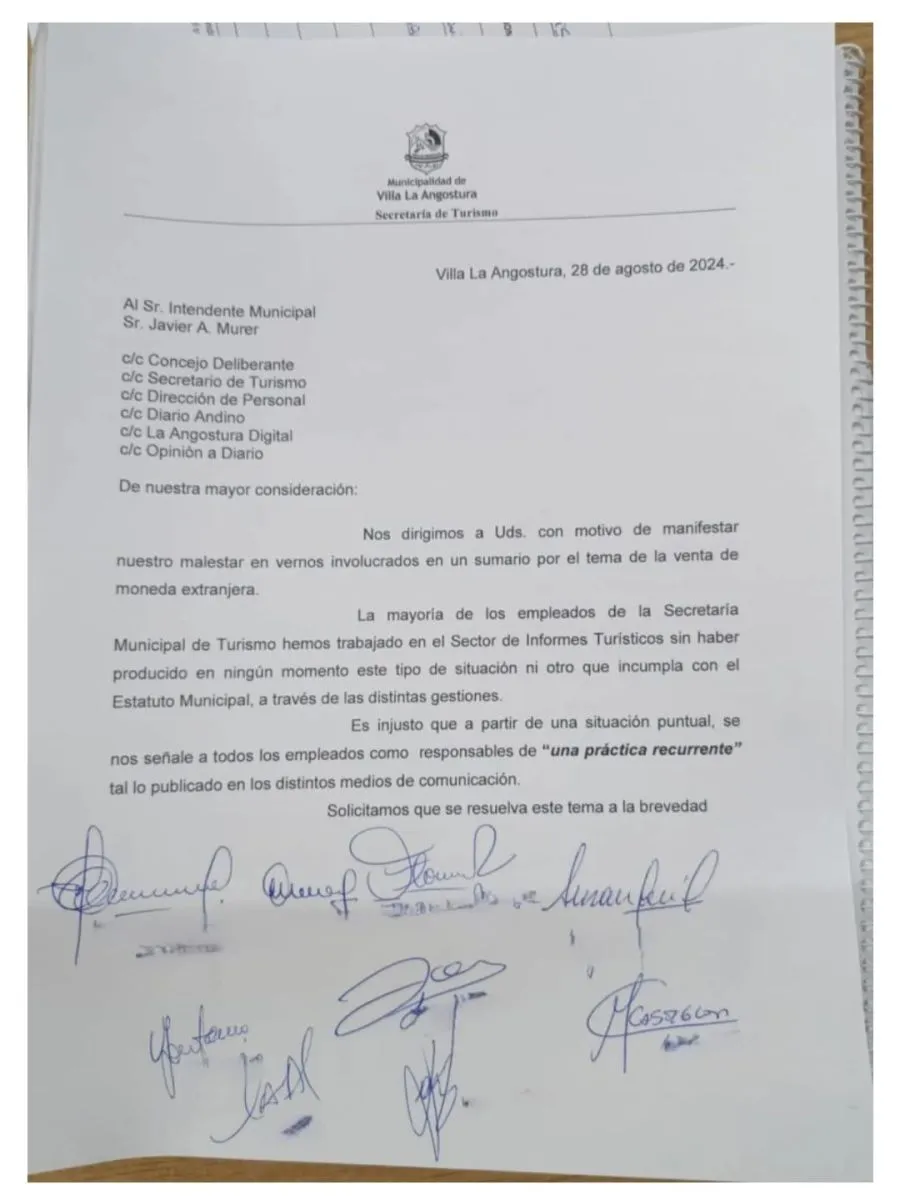 Por medio de una nota dirigida a los medios, empelados de la Secretaría de Turismo local se despegaron de la venta de Dólares que se realizaba en las dependencias de la cartera.
