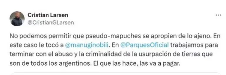 Larsen, abogado especializado en Derecho Tributario, Administración y Políticas Públicas, agregó: "En este caso, le tocó a Manu Ginóbili. Trabajamos para terminar con el abuso y la criminalidad de la usurpación de tierras que son de todos los argentinos. El que las hace, las va a pagar". Estas declaraciones refuerzan la postura del Estado frente a los conflictos de tierras que involucran a comunidades originarias y privados.
