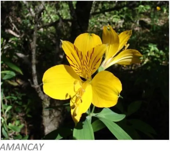 El Amancay (Alstroemeria aurea)  Es una flor vistosa de color amarillo o anaranjado, las mismas están dispuestas en umbelas terminales de 2 a 8 flores. El fruto es una capsula con forma de bellota, que explota dispersando sus semillas redondas de color marrón claro.