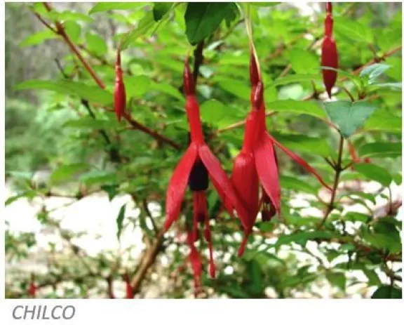 Chilco (Fuchsia  magellanica)  Es un arbusto erguido. Las hojas son lanceoladas de borde dentado. Las flores son colgantes salen de las axilas de las hojas, los pétalos son morados del mismo tamaño formando como un tubo, tienen largos peciolos y sépalos de color rojo. Los frutos son alargados y carnosos rojo violáceos casi negros de 1 a 2 cm crece en los bosques Andino patagónicos de Argentina y Chile,  en zonas húmedas, se los ve generalmente a la vera de vertientes de agua y humedales.