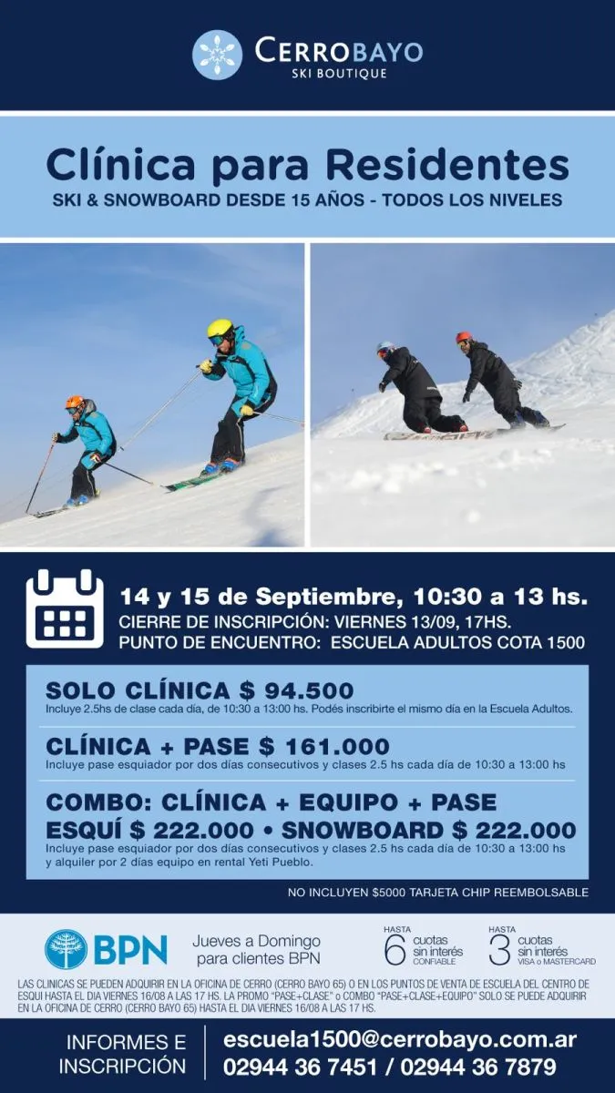 El centro de deportes invernales del Cerro Bayo anunció que este fin de semana se realizará una nueva clínica de esquí y de snowboard destinada a residentes.