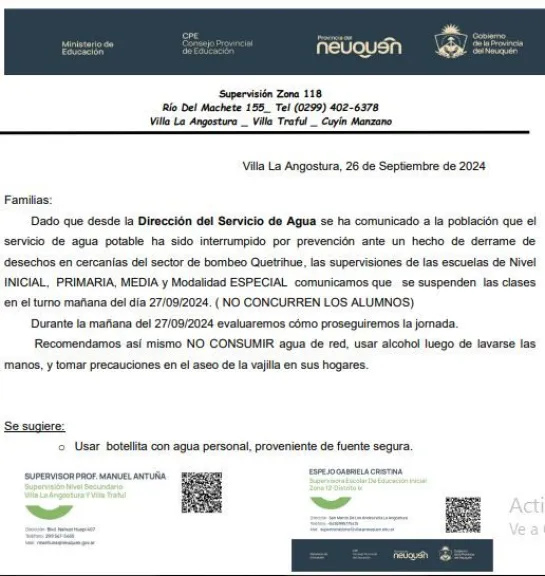 as supervisiones de las escuelas de Nivel Inicial, Primaria, Media y Modalidad Especial informan a la comunidad educativa que, debido a un incidente de derrame de desechos en cercanías del sector de bombeo Quetrihue, comunicado por la Dirección del Servicio de Agua, se suspenden las clases en el turno mañana del día 27/09/2024. Los alumnos no deben concurrir a los establecimientos educativos.