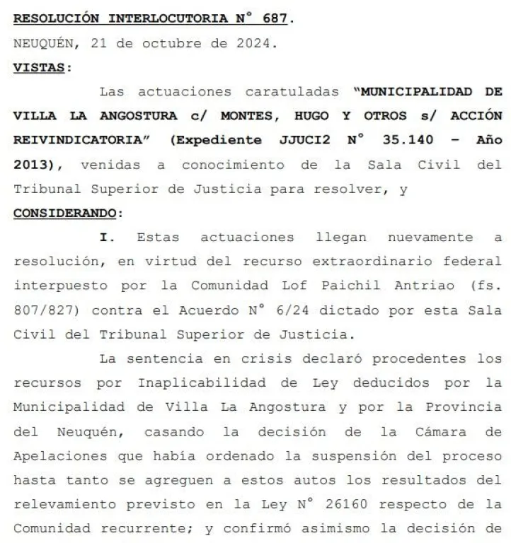 El Tribunal Superior de Justicia de Neuquén resolvió rechazar el recurso extraordinario federal presentado por la Comunidad Lof Paichil Antriao, confirmando así la sentencia impugnada que favorece a la Municipalidad de Villa La Angostura en la disputa por la propiedad de tierras. La decisión mantiene la resolución de primera instancia que declaró procedente la acción reivindicatoria impulsada por el municipio, con imposición de costas a la comunidad indígena.