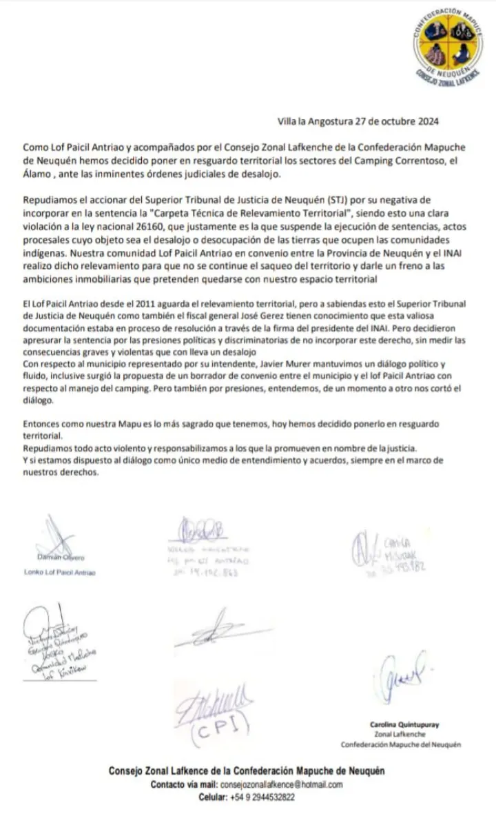 El Lof Paicil Antriao, y acompañado por el Consejo Zonal Lafkenche y la Confederación Mapuche de Neuquén, emitió un comunicado para dar a conocer la decisión de "poner en resguardo territorial los sectores del Camping Correntoso, el Álamo, ante las inminentes órdenes judiciales de desalojo".