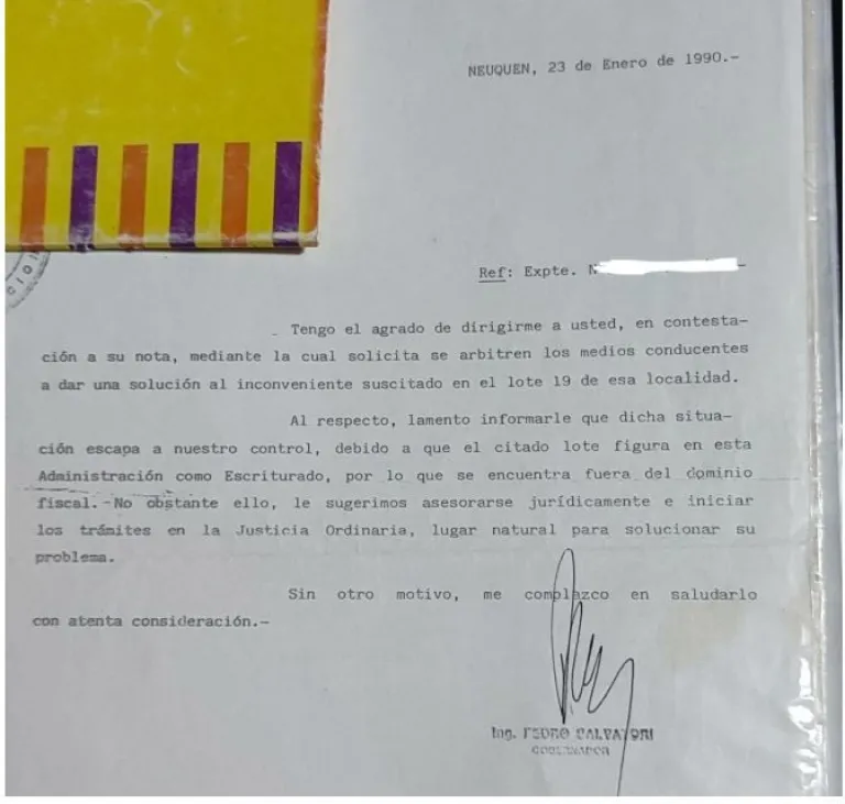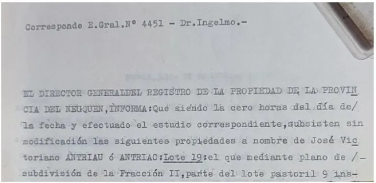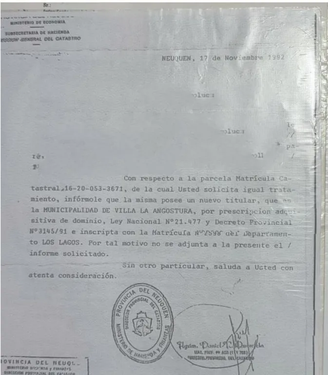 7- Respuesta a la carta documento enviada por Enrique Antriao a la municipalidad de Villa la Angostura, donde se alega la posesión del inmueble desde el año 1950, lo cuál queda comprobado por los fragmentos expuestos anteriormente, que es una falacia.