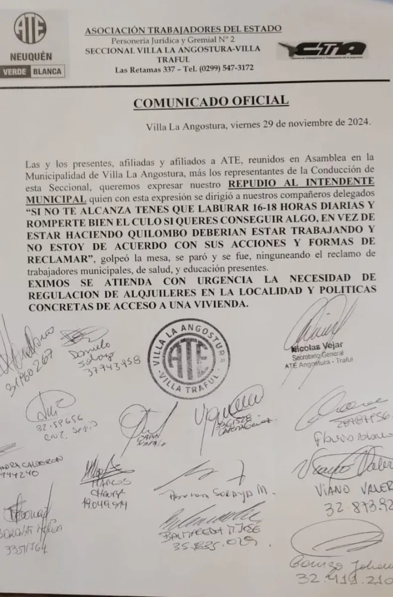 En ese sentido, el gremio publicó en sus redes sociales un documento en donde manifestó “repudio” por los dichos de Murer quien ( siempre según la versión del gremio), les habría dicho: “ sino te alcanza, tenes que laburar 16 -18 horas diarias y romperte bien el culo si querés conseguir algo. En vez de estar haciendo quilombo, deberían estar trabajando y no estoy de acuerdo con sus acciones y formas de reclamar”