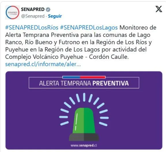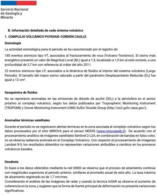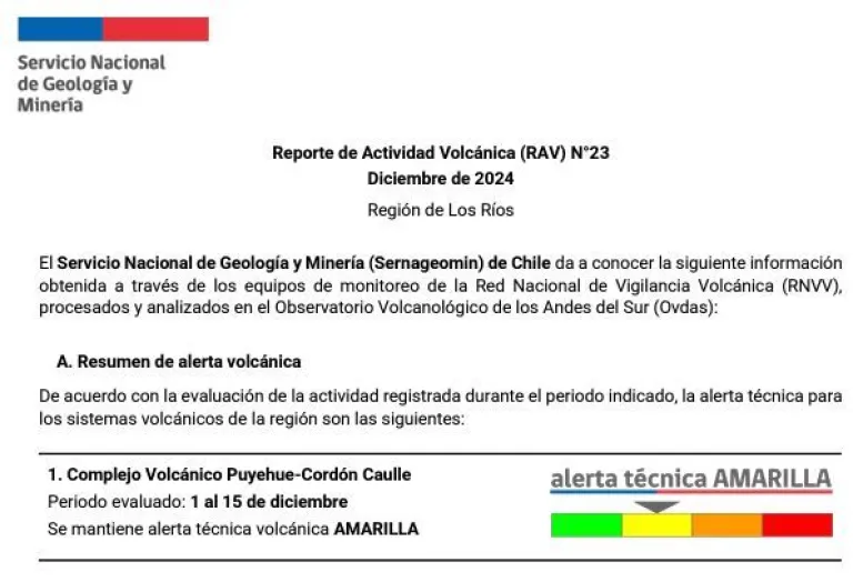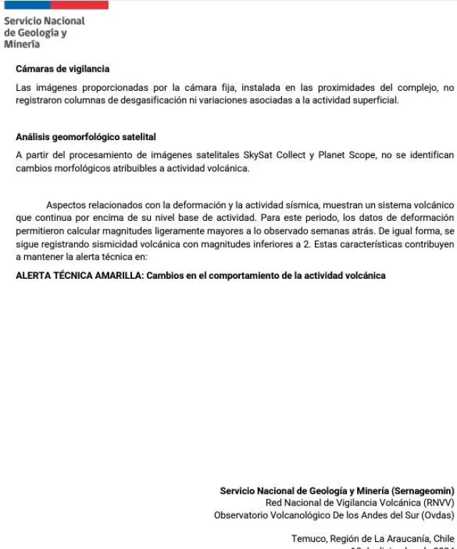 A pesar de este comportamiento, el Sernageomin decidió mantener la alerta técnica amarilla para el complejo volcánico. Esta medida, que está activa desde el 26 de abril de 2024, continuará en vigor “hasta que las condiciones del evento así lo justifiquen”, según indicó el Servicio Nacional de Prevención y Respuesta ante Desastres (Senapred).