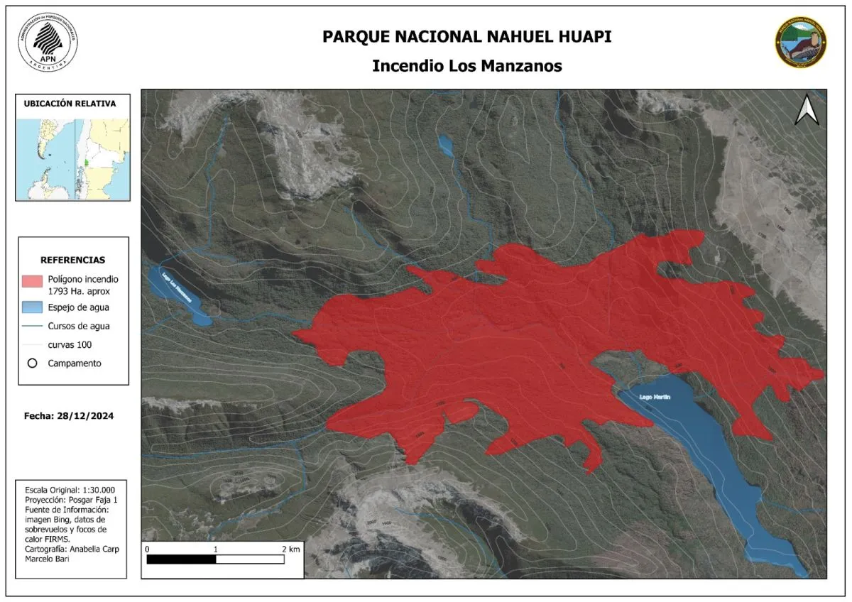 Por medio de un parte de prensa oficial, la Intendencia del Parque Nacional Nahuel Huapi informó sobre la situación actual del incendio que afecta la zona sur del área protegida, específicamente en la Reserva Estricta, iniciado el miércoles 25 de diciembre en cercanías del Lago Los Manzanos.