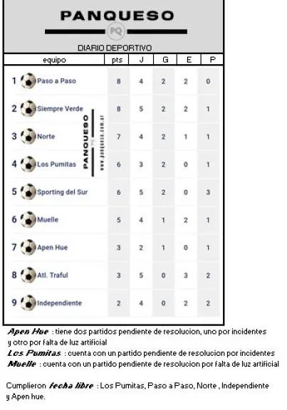 La jornada del sábado habia comenzado con un encuentro lleno de goles, Los Pumitas vencieron 5-4 a Independiente y cerrando la quinta fecha Muelle y Norte no se sacaron ventajas pero se lucieron hacia el espectáculo brindando un empate en tres goles.