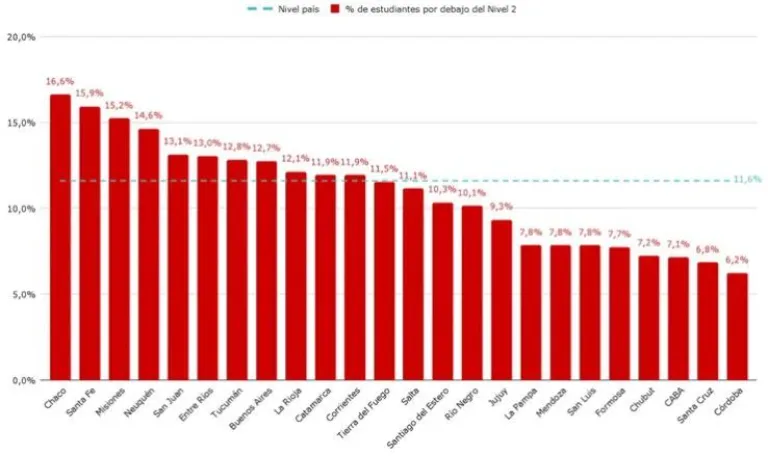 Las provincias con mayores porcentajes de estudiantes que no logran leer son Chaco (16,6%), Santa Fe (15,9%) y Misiones (15,2%), seguidas por Neuquén. En contraste, Córdoba (6,2%), Santa Cruz (6,8%) y CABA (7,1%) muestran los mejores indicadores.