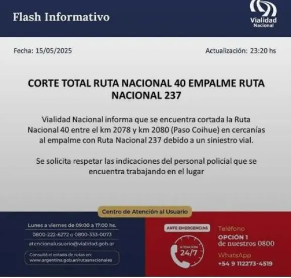Se solicita a los conductores respetar los desvíos señalizados y mantenerse informados a través de los canales oficiales de Vialidad Nacional y Defensa Civil.