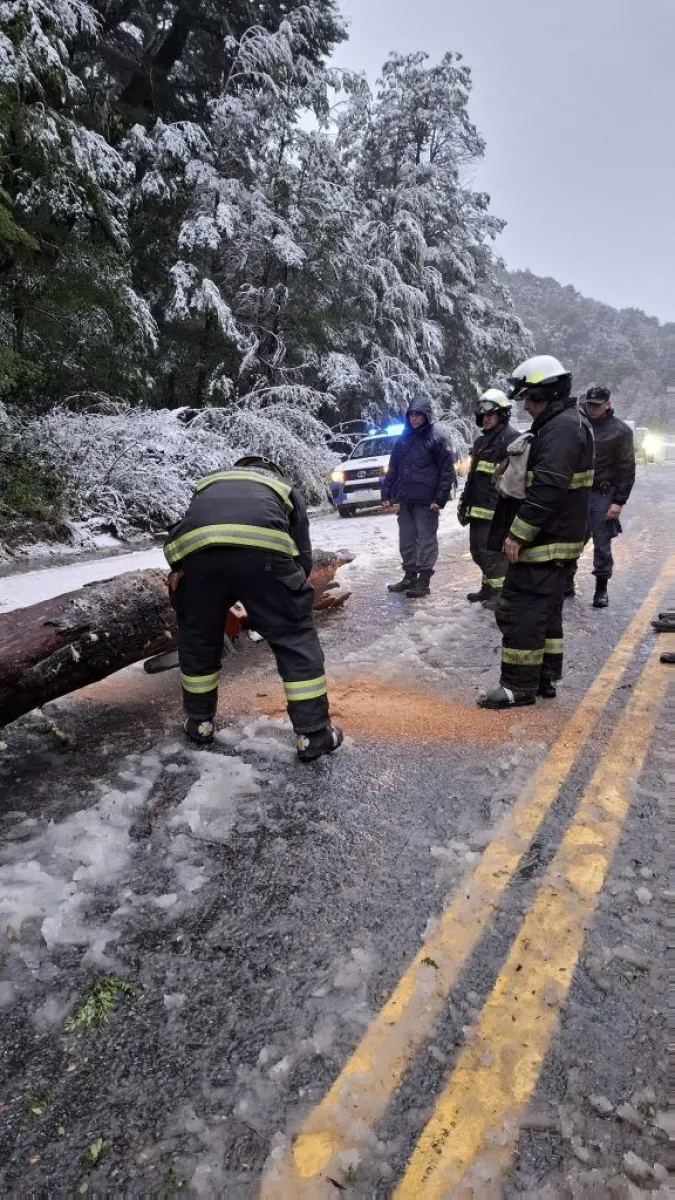 Un árbol bloqueó la Ruta 40 en el empalme con la 231, mientras la nieve complica la Ruta de los Siete Lagos . Defensa Civil y municipios piden máxima precaución.