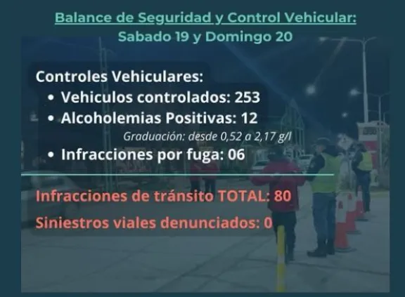 Los resultados reflejan un operativo sólido en términos de prevención y concientización. En total, se verificaron 253 vehículos, de los cuales se detectaron 12 conductores con niveles de alcohol en sangre superiores al permitido, registrando graduaciones que alcanzaron hasta 2,17 gramos por litro.