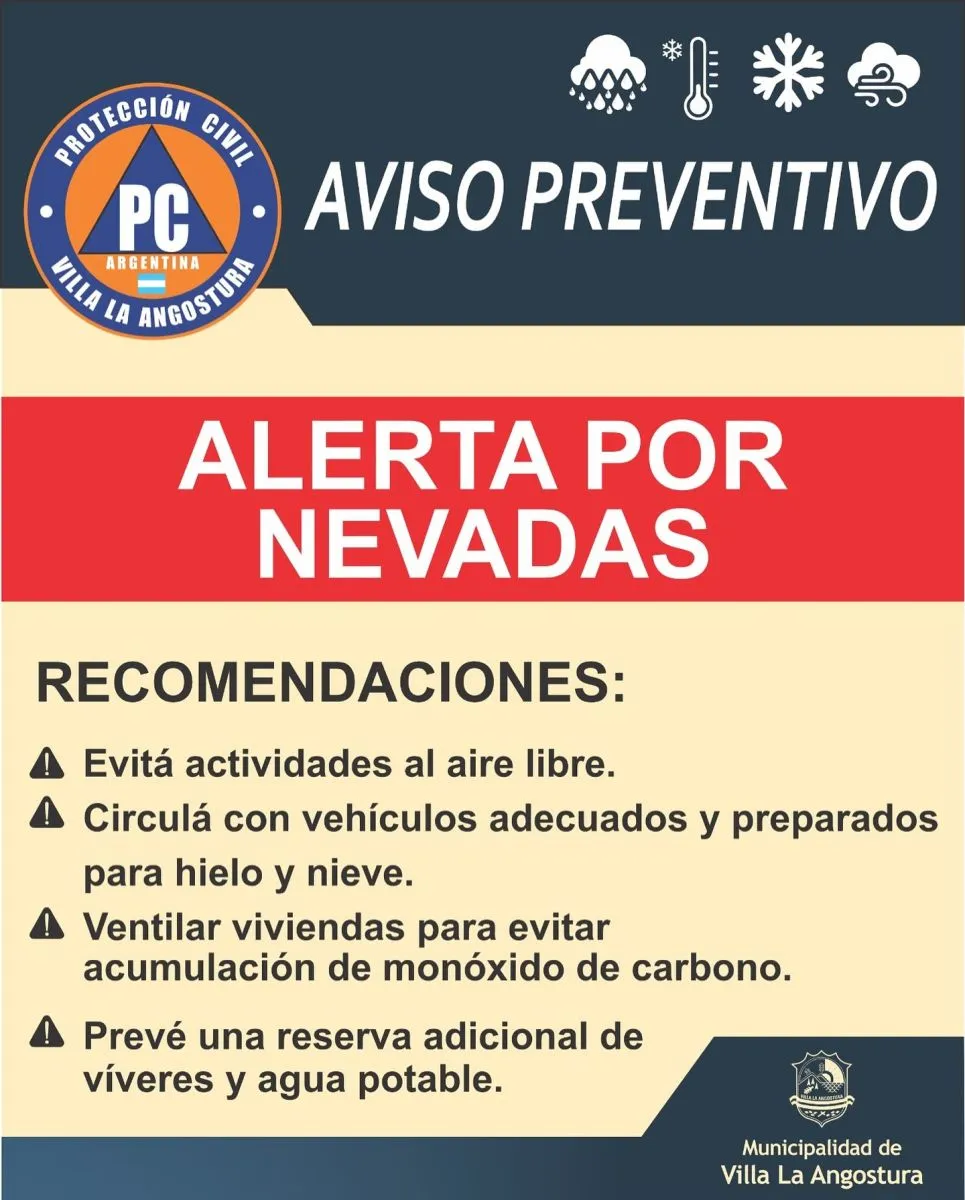 La Dirección de Protección Civil emitió una serie de recomendaciones a la población tras el alerta por nevadas difundido por el Servicio Meteorológico Nacional (SMN). Según el informe, se espera que el fenómeno climático afecte a distintas zonas del territorio durante toda la jornada del viernes.