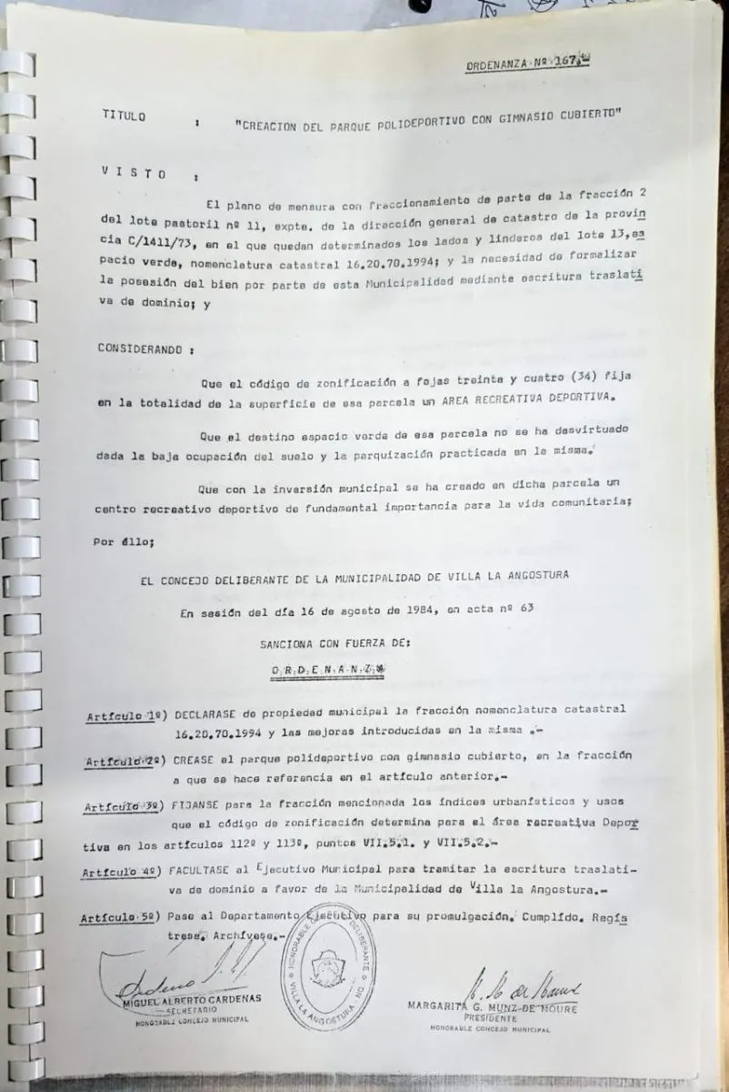 La ordenanza fue sancionada el 16 de agosto de 1984 y lleva el número 167. En el apartado de fundamentos —lo que habitualmente se titula “Considerando”— se hace mención a que el código de zonificación de la localidad identifica el lote catastral 16-20-70-1994 como un área “recreativa deportiva”.