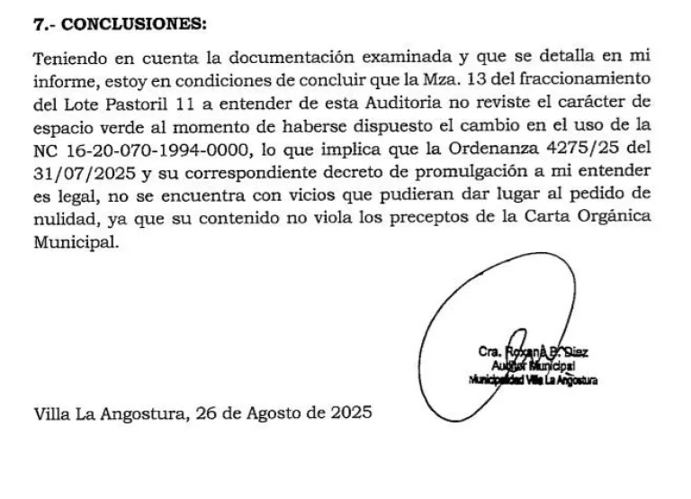 El informe de la auditora Roxana Diez concluyó que la manzana 13 del lote pastoril 11 no reviste carácter de espacio verde, por lo que la ordenanza 4275 y su decreto de promulgación son válidos.