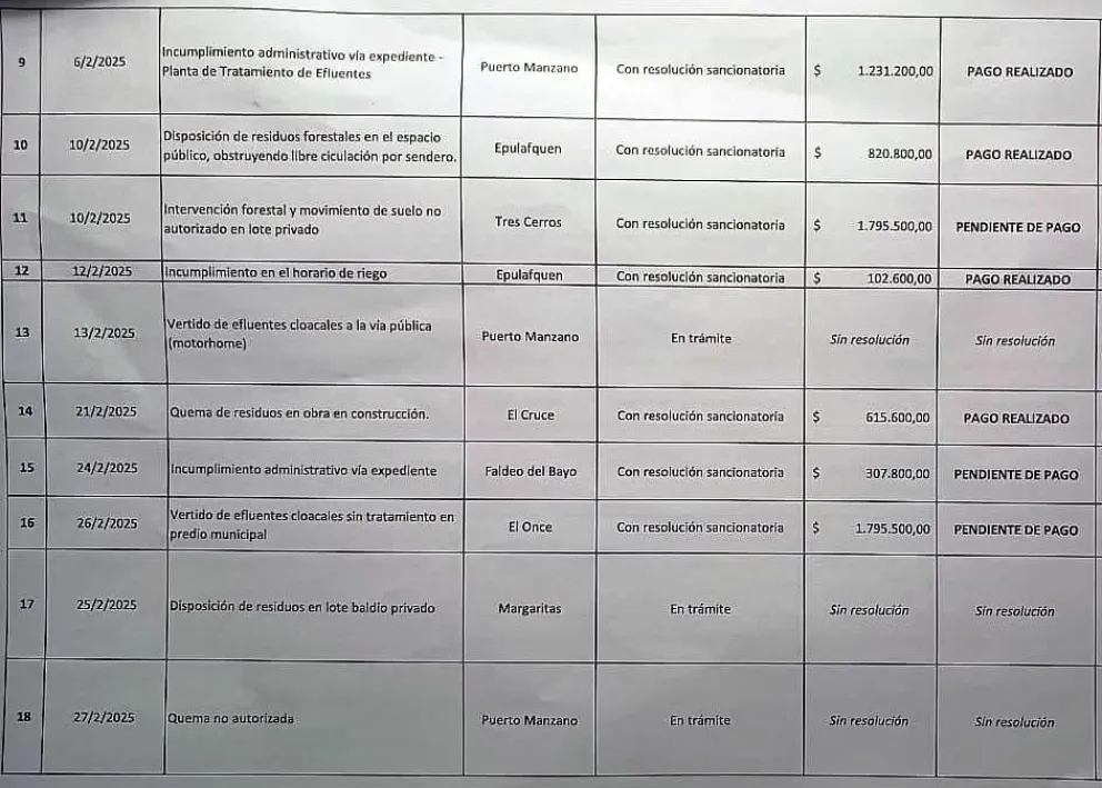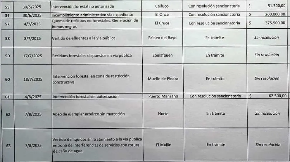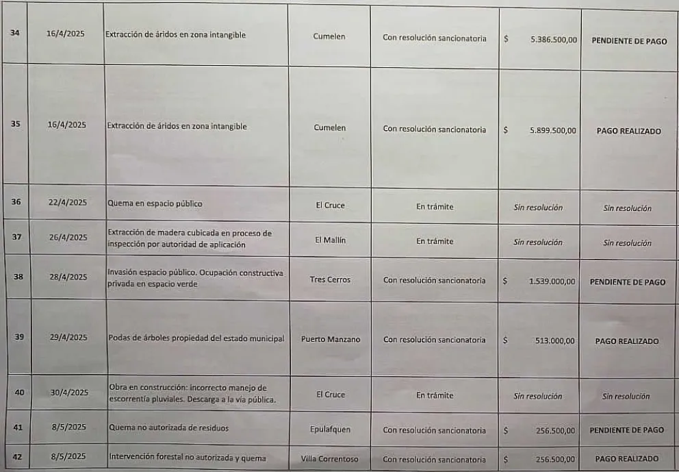 La sanción más elevada registrada hasta la fecha corresponde a un particular en Cumelén, donde se detectaron intervenciones forestales, movimientos de suelo y obras en zona de restricción constructiva sin autorización, el 6 de marzo pasado. A ese infractor se le imputó una penalidad de  $10.003.500 y la restauración de la zona afectada.