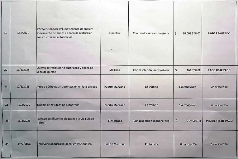 Un informe oficial de la Secretaría de Planeamiento, Medio Ambiente y Obras Públicas, elaborado por la arquitecta Andrea Aldea y la directora de Ambiente, Jessica Marini, reveló que entre el 1° de enero y el 12 de agosto se labraron 63 infracciones ambientales en el municipio.