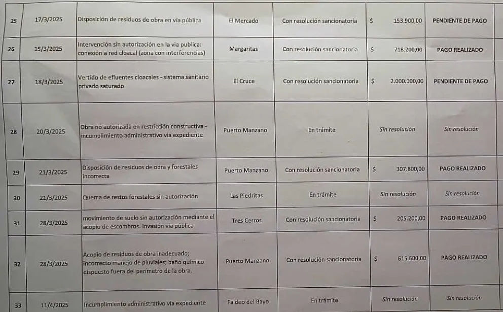 Hasta el momento, el municipio lleva recaudados 41,7 millones de pesos por multas ambientales. Sin embargo, todavía quedan pendientes de pago infracciones que suman más de 25.1 millones de pesos.