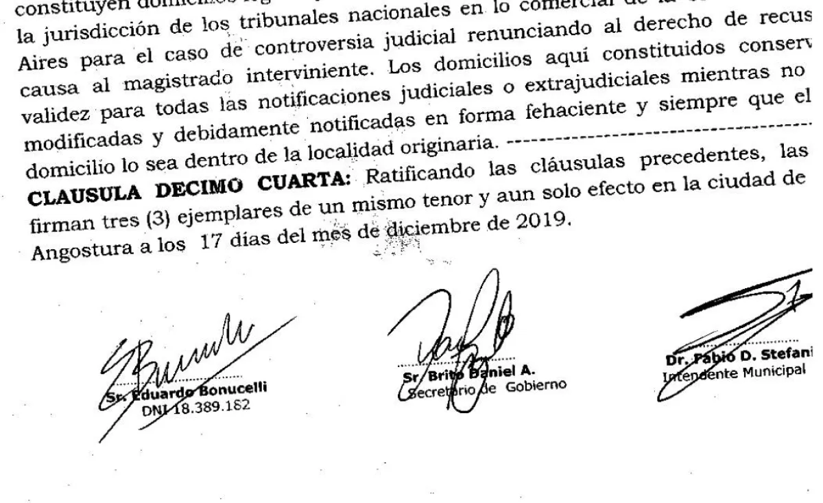 Según la documentación que obra en el expediente y a la que accedió diarioandino, el contrato original lleva, junto a la firma falsa del representante, las firmas del  por entonces  intendente Fabio Stefani y del ex Secretario de Gobierno ( luego Secretario de Economía) Daniel Brito.