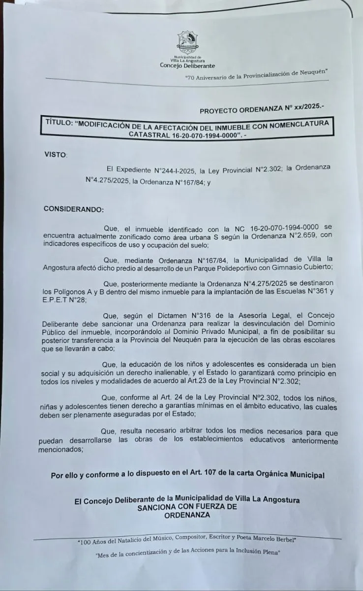 La mañana de este lunes encontró al Concejo Deliberante de Villa La Angostura en una situación de tensión inusual. Una sesión extraordinaria fue convocada con carácter urgente para tratar la modificación de la afectaciòn del predio del CEF, con el objetivo de cederlo a la Provincia y permitir la construcción de dos escuelas.