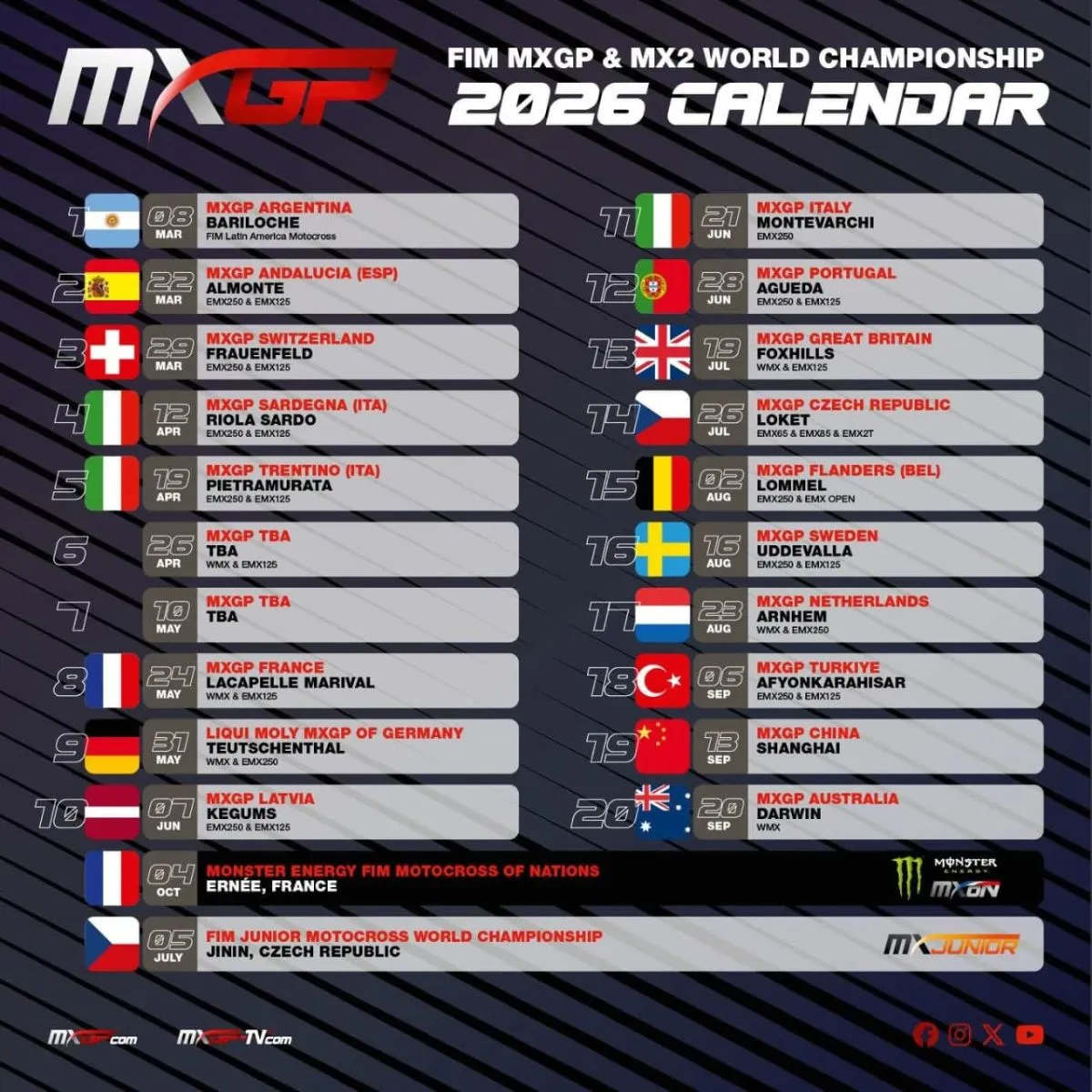 El rumor se confirmó finalmente este día viernes, Bariloche será la nueva sede del MXGP 2026 los días 7 y 8 de Marzo. Desde la página oficial se dio la confirmación del calendario que tendrá a la vecina ciudad abriendo el calendario 2026.