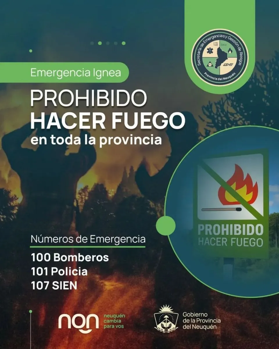 En el marco del Estado de Emergencia Ígnea vigente en la Provincia del Neuquén, y ante el actual contexto de riesgo extremo de incendios forestales y de interfase, desde la Brigada de Incendios de la Provincia del Neuquén, que opera en esta localidad, se informa lo siguiente: