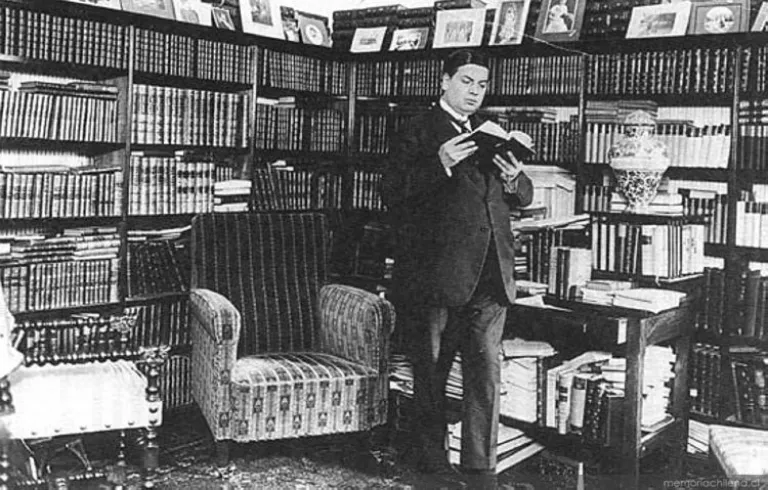Joaquín Díaz Garcés en su biblioteca, hacia 1900. Fuente: Joaquín Diaz Garcés : (Angel Pino) : su vida y su obra : (1878-1921) / E. Evangeline Mundy. Santiago : El Mercurio , 1995.