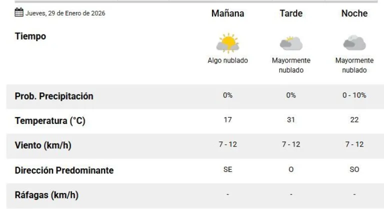 Para este jueves, el Servicio Meteorológico Nacional anuncia una temperatura máxima de 31°. El cielo estará algo nublado, con vientos leves del Oeste rotando al el Sudoeste y cielo parcialmente nublado.
