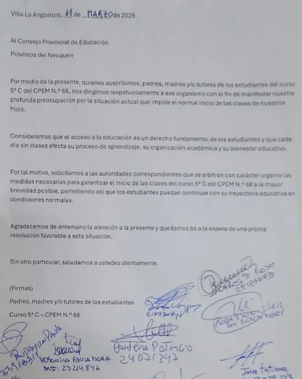 Frente a esta situación, los padres elaboraron una nota formal dirigida al Consejo Provincial de Educación, solicitando la apertura urgente del curso.