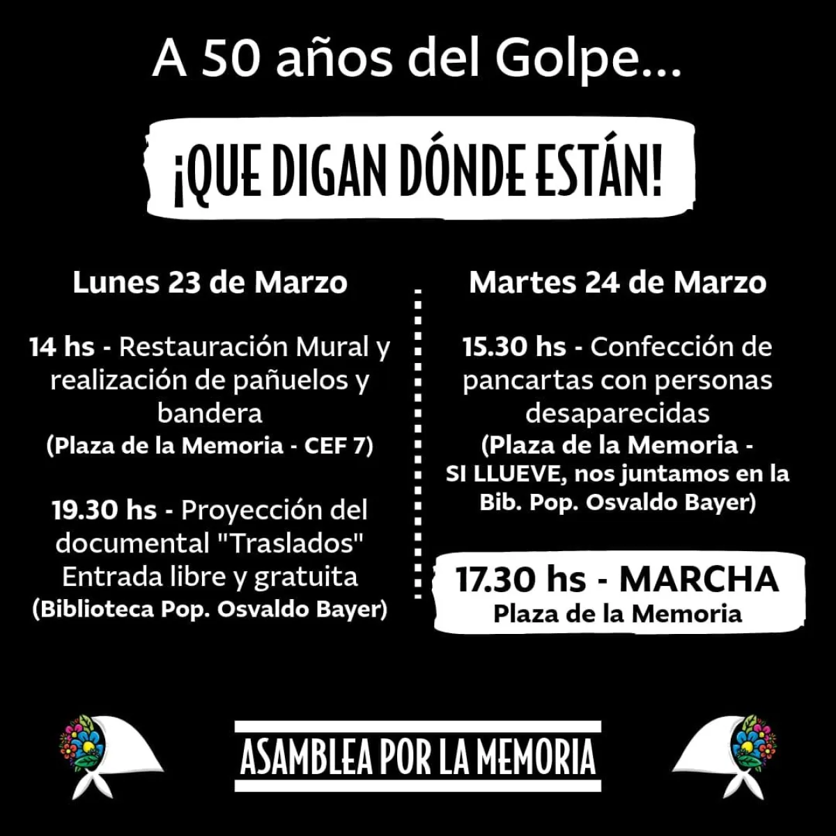 “SI EL 24/3 LLUEVE NOS JUNTAMOS A PARTIR DE LAS 15.30 EN LA BIB. POP. OSVALDO BAYER Y LUEGO VAMOS A LAS 17.30 A LA PLAZA DE LA MEMORIA PARA INICIAR LA MARCHA.”